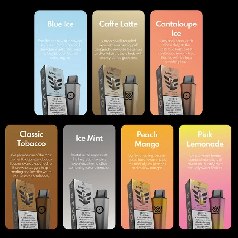Blueberry Mist ,Cafe Latte ,Classic Tobacco ,Peach Mango ,Pink Lemonade ,Sour Blue Raspberry ,Strawberry Kiwi ,Watermelon Breeze |